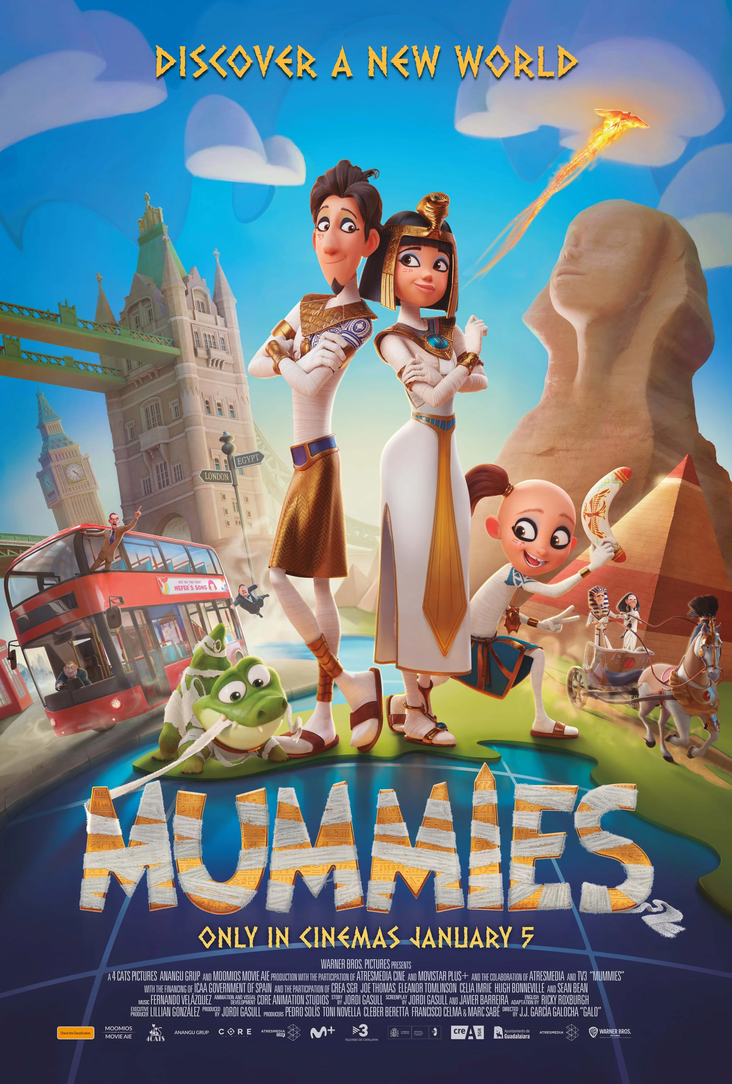 Warner Bros. Pictures’ animated adventure feature film "Mummies", from Spanish director Juan Jesús García Galocha, features an impressive voice cast including Joe Thomas ("The Inbetweeners", "White Gold"), Eleanor Tomlinson ("The Nevers", "Jack the Giant Slayer", "The Illusionist"), Santiago Winder ("The Hope Rooms"), Celia Imrie ("The Best Exotic Marigold Hotel", "Mamma Mia! Here We Go Again"), Dan Starkey ("Doctor Who"), Hugh Bonneville ("Paddington", "Downton Abbey", "Notting Hill"), singer, songwriter and record producer Shakka and Sean Bean ("Game of Thrones", "The Martian", "The Lord of the Rings”).